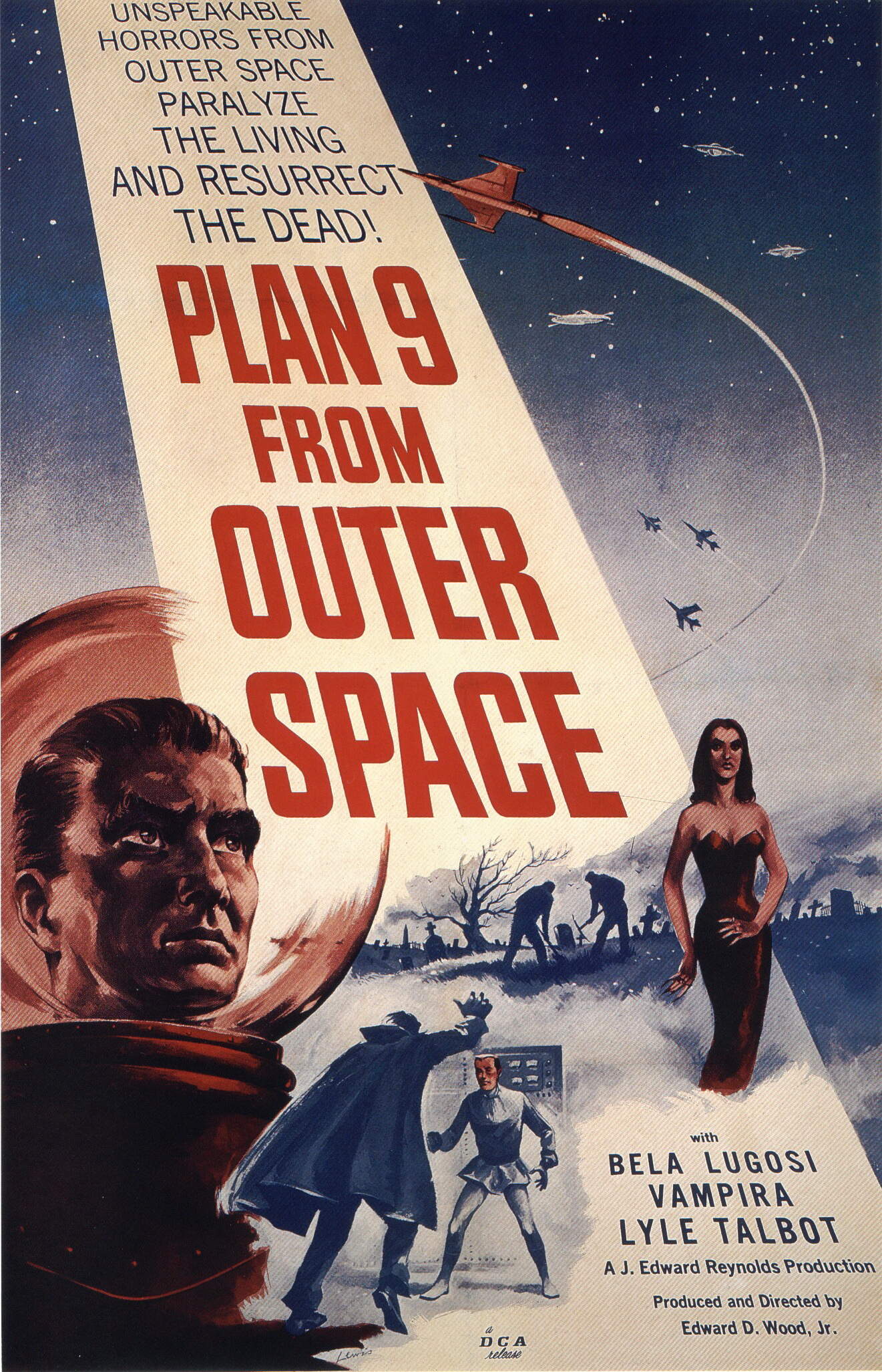 Plan 9 from Outer Space è un film horror fantascientifico del 1959 scritto e diretto da Edward D. Wood Jr. Venne proiettato in anteprima nel 1957 col titolo Grave Robbers From Outer Space. Considerato il film più famoso del regista, venne completamente ignorato dalla critica fino al 1978, anno della morte del regista, quando i critici Harry Medved e Randy Dreyfuss lo definirono “Il peggior film di tutti i tempi“.